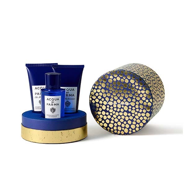 Un elegante set de regalo de tres piezas que incluye Arancia di Capri La Riserva Eau de Parfum 50 ml, Hand & Body Wash 75 ml y Hand & Body Lotion 75 ml. Presentado en un cofre diseñado por Cristina Celestino, este set refleja la audaz reinterpretación gráfica de la artesanía tradicional, con acabado en el emblemático azul de Blu Mediterraneo, realzado con toques dorados y etiqueta en relieve.
