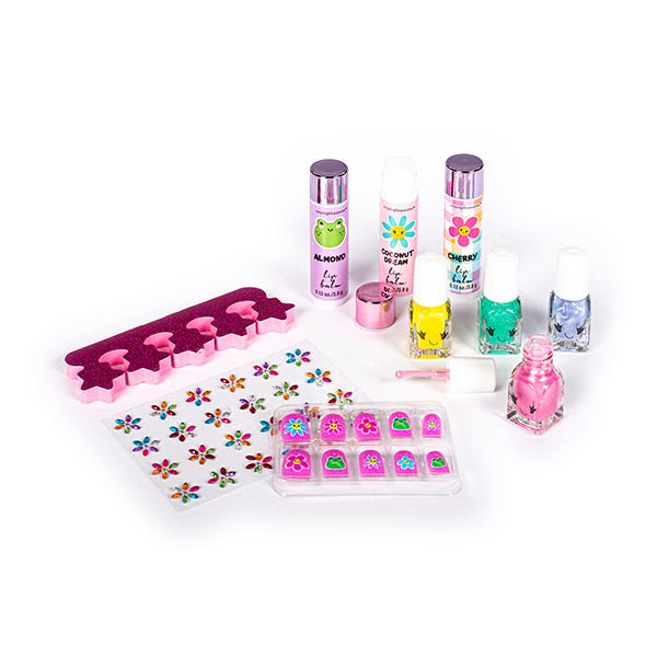 Incluye cuatro esmaltes con colores veraniegos, separador de dedos, tres bálsamos labiales, uñas postizas y pegatinas de uñas.