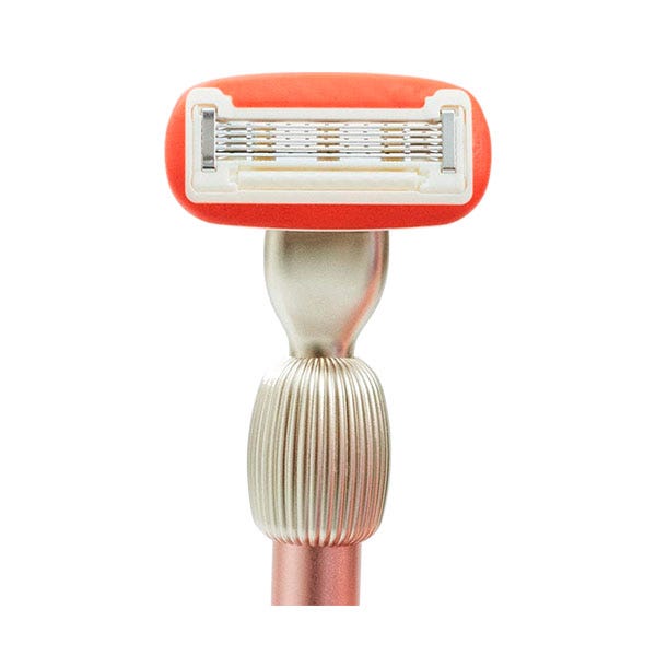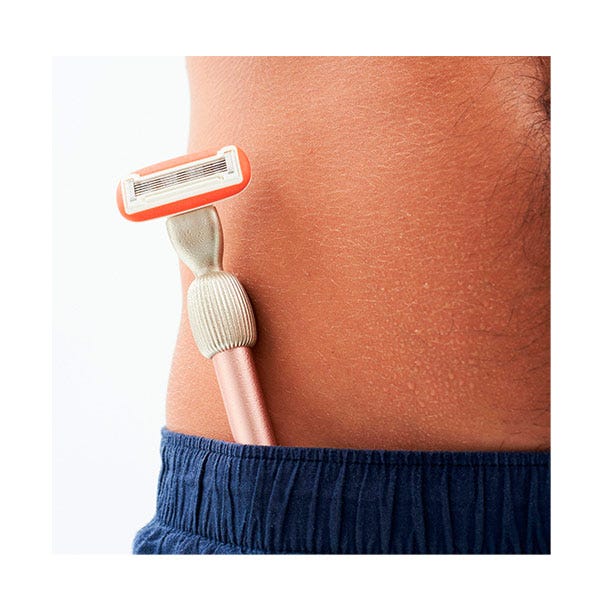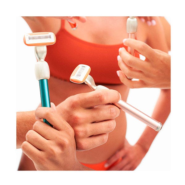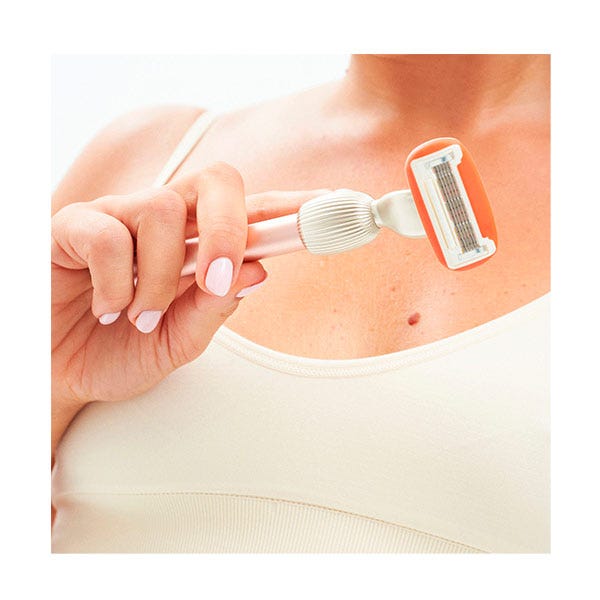 Humedece el cabezal de la cuchilla de afeitar en agua para activar el anillo lubricante y pásalo sobre el área interesada para proceder a la depilación.