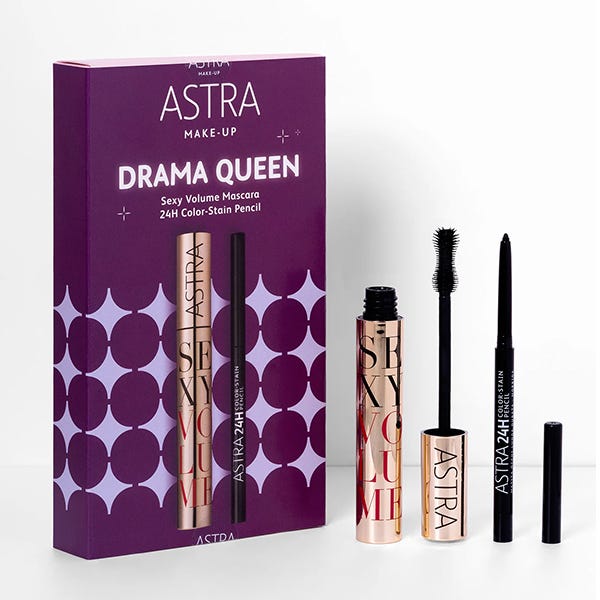 "Drama Queen" es el combo perfecto para las amantes del glamour atrevido pero refinado: Sexy Volume Mascara para unas pestañas seductoras y 24H Colour Stain Pencil para intensificar la mirada con clase y elegancia.