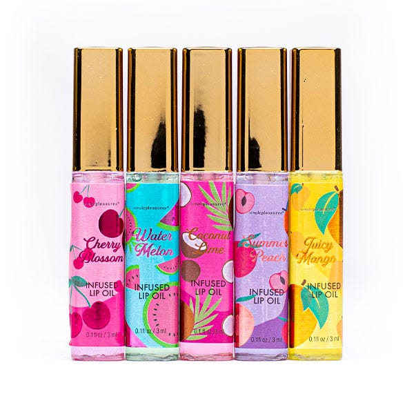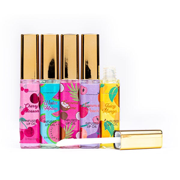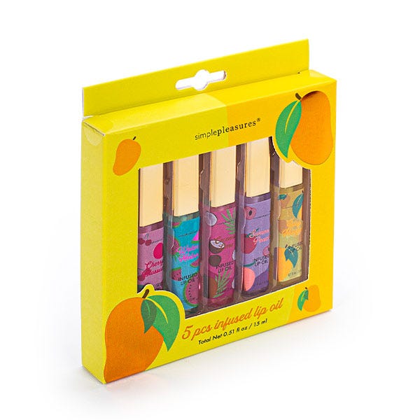 Set de 5 aceites labiales con sabor a frutas, que hidratan tus labios en profundidad.