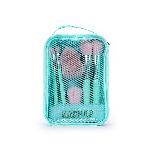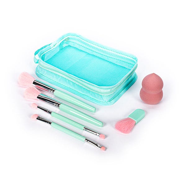 Set que incluye cinco brochas de maquillaje, una esponja de maquillaje y un neceser ideal para llevar tus esenciales a todos tus viajes.