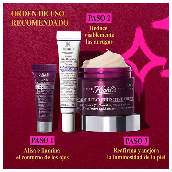 Aplicar la crema hidratante Super Multi-Corrective cream por la mañana y noche sobre el rostro y cuello. Usar el contorno de ojos Super Multi-Corrective Eye Zone Treatment con suaves toques alrededor de todo el área del contorno de los ojos. Aplicar el sérum de Retinol Micro-Dosis cada noche, evitando el contorno de los ojos, y complementar con protector solar durante el día.