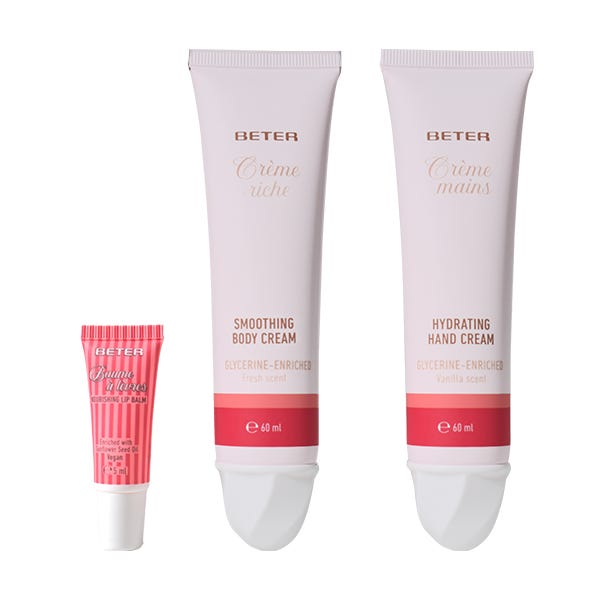 Un conjunto con tres esenciales de cuidado diario: crema corporal suavizante, crema de manos hidratante y bálsamo labial nutritivo. Una rutina completa de hidratación, perfecta para regalar o para llevar siempre contigo.