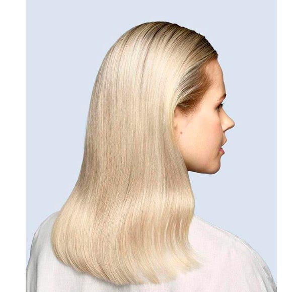 Un champú con pigmento violeta y extracto de mora que neutraliza los tonos dorados en cabellos rubios, blancos y grises.