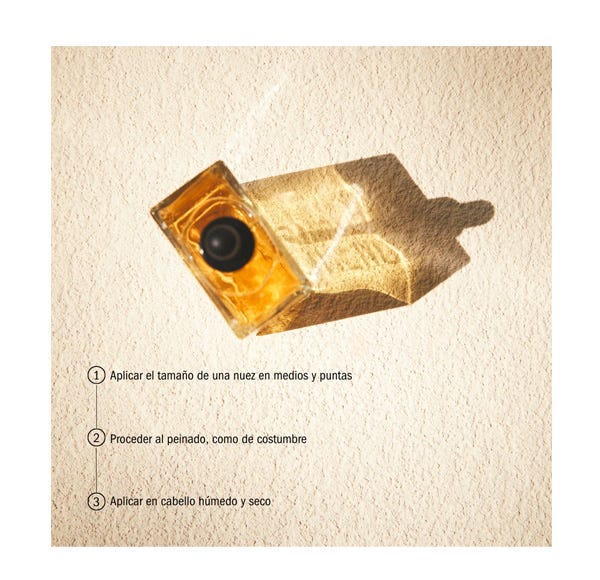 Con el cabello seco, aplica dos gotas en la palma de la mano y reparte por medios y puntas de una manera homogénea.