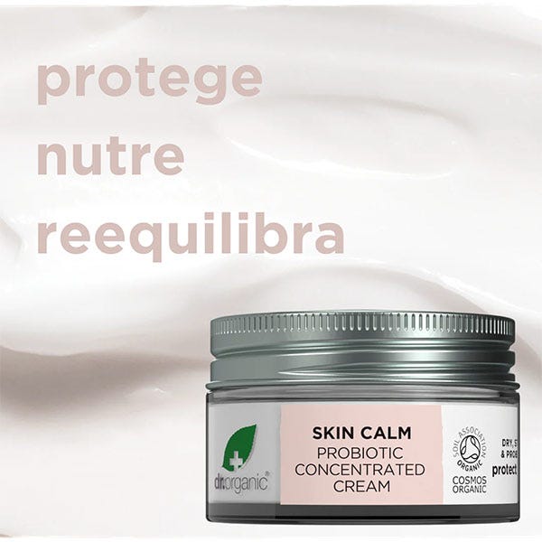 La Crema Probiótica Skin Calm de Dr. Organic es un tratamiento intensivo diseñado para nutrir, proteger y restaurar la barrera cutánea, ayudando a reequilibrar el microbioma de la piel.