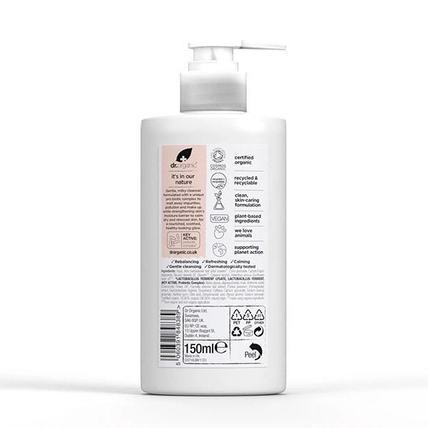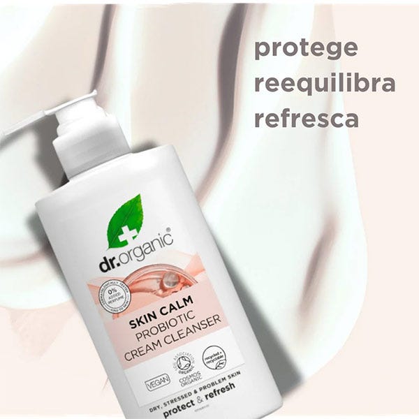 La Crema Limpiadora Probiótica Skin Calm de Dr. Organic es un limpiador suave y lechoso, diseñado para eliminar eficazmente impurezas, maquillaje y contaminación sin alterar la barrera natural de la piel.