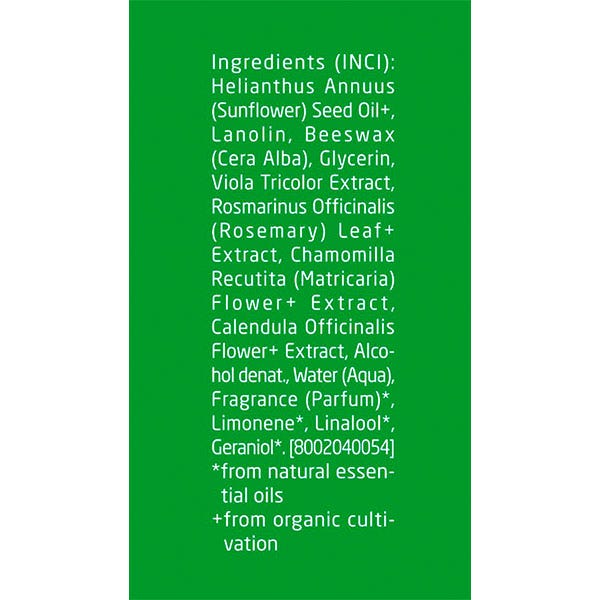 Helianthus Annuus (Sunflower) Seed Oil⁺, Theobroma Cacao (Cocoa) Seed Butter⁺, Euphorbia Cerifera (Candelilla) Wax, Glycerin, Rosmarinus Officinalis (Rosemary) Leaf Extract, Chamomilla Recutita (Matricaria) Flower⁺ Extract, Calendula Officinalis Flower⁺ Extract, Viola Tricolor Extract, Alcohol denat., Water (Aqua), Pentylene Glycol, Fragrance (Parfum), Benzyl Alcohol, Beta-Caryophyllene, Citrus Aurantium Flower Oil, Citrus Aurantium Peel Oil, Lavandula Oil/ Extract, Limonene, Linalool, Linalyl Acetate, Pinene, Terpineol.