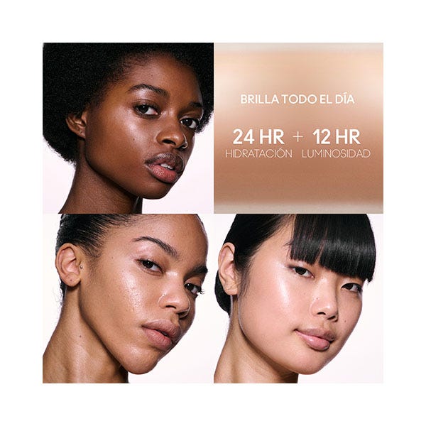 Proporciona 24 horas de hidratación y 12 horas de luminosidad para un efecto de piel de cristal que dura... y dura. Los nueve tonos flexibles y fluidos se activan gracias a una brillante mezcla compleja de pigmentos radiantes y partículas nacaradas que logran el equilibrio perfecto entre brillo, opacidad y color difuminado.