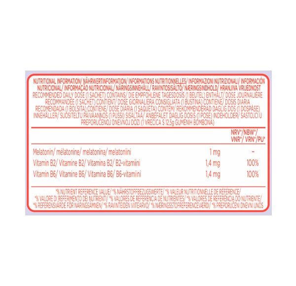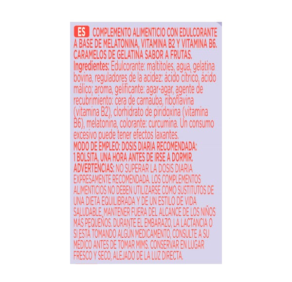Complemento alimenticio con edulcorante a base de melatonina, vitamina B2 y Vitamina B6. Caramelos de gelatina sabor a frutar.