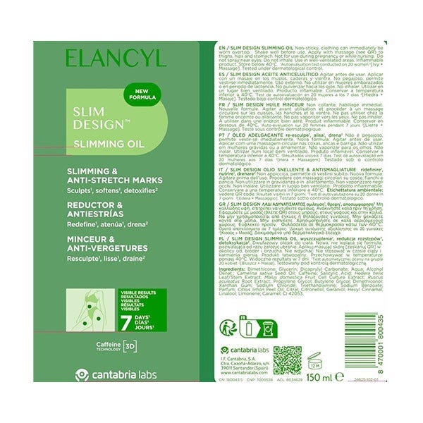 Aceite Anticelulítico Slim Design Elancyl a base de Cafeína y aceite de Camelina.