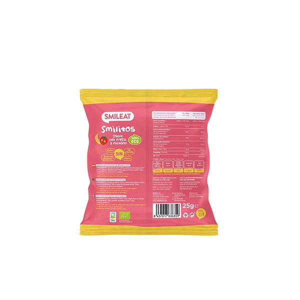 Smilitos de fresa y plátano con un formato que facilita que se lo coma sin ayuda, ya que son más grandes para que los coja de uno en uno y lo vaya deshaciendo sin metérselo entero en la boca. Recomendamos que supervises las primeras veces que lo tome, como con todos los alimentos.