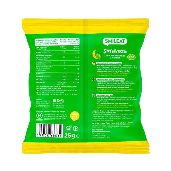 Snack 100% ecológico hecho a base de maíz horneado y aceite de oliva virgen extra con sabor a manzana y plátano 100% ecológico