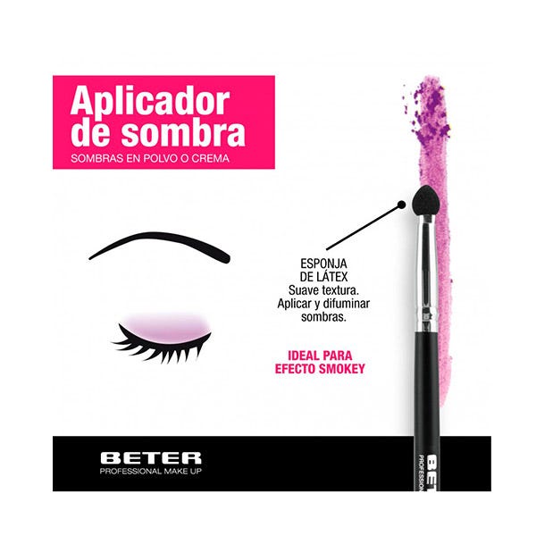 Aplica y difumina las sombras de ojos con el sombreador en esponja de látex para párpados de Beter. Ideal para conseguir un maquillaje de ojos ahumados. Gracias a su esponja de látex de suave textura consigue el difuminado y la aplicación perfecta de diferentes tipos de sombras. Apto para sombra de ojos en polvos y en crema. ¡Consigue unos ojos de ensueño!