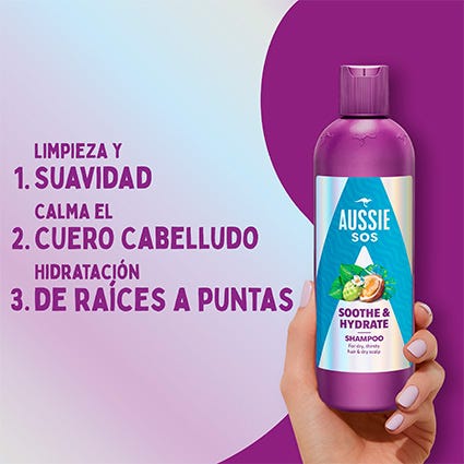 El champú Aussie SOS Soothe & Hydrate será tu salvación. Enriquecido con superalimentos australianos, este champú delicado hidrata y calma tu cuero cabelludo mientras nutre el pelo, dejándolo suave, liso y brillante de raíz a puntas.