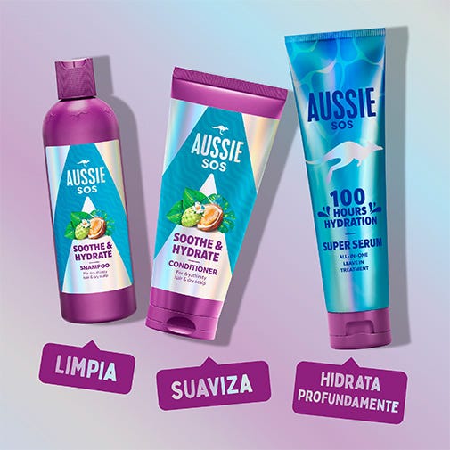 Para obtener los mejores resultados, úsalo junto con otros productos de la línea de cuidado capilar Aussie SOS Soothe & Hydrate, que incluye nuestro acondicionador y mascarilla capilar.