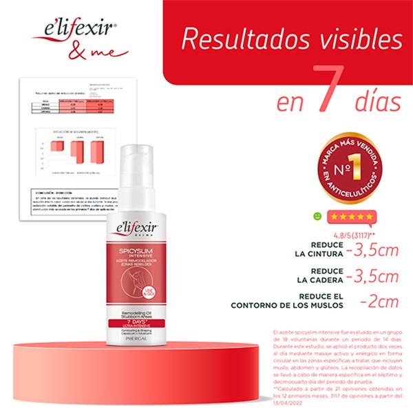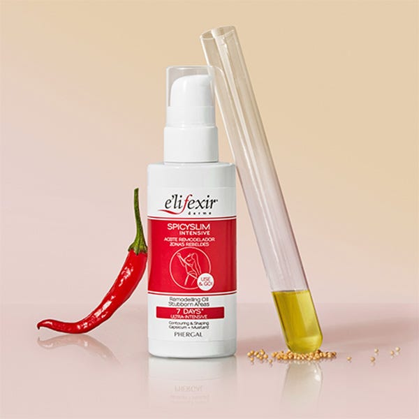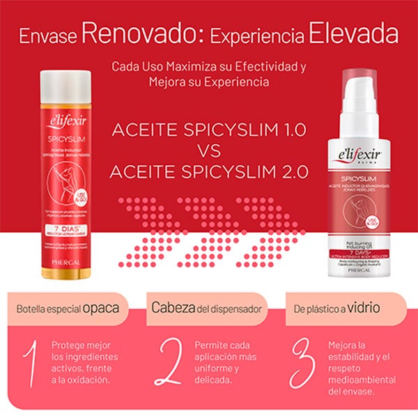 Elfexir Dermo Spicyslim es un aceite seco inductor quemagrasas de zonas rebeldes.