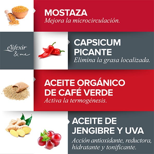 Formulado con Mostaza y Capsicum picante, que activan la circulación para una mayor eficacia y aumentan la termogénesis potenciando la eliminación de la grasa localizada, Además, contiene aceite de Café Verde que mantiene y estimula la energía celular para asegurar unos resultados visibles en 7 días.