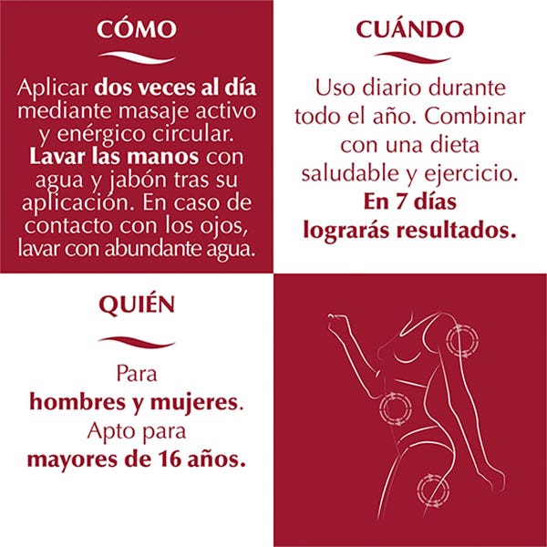 Aplicar 2 veces al día mediante masaje activo y enérgico circular en las zonas a tratar. Lavar las manos con agua y jabón tras su aplicación. En caso de contacto con los ojos, lavar con abundante agua.