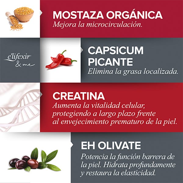 Formulado con Mostaza y Capsicum picante, que activan la circulación para una mayor eficacia y aumentan la termogénesis potenciando la eliminación de la grasa localizada. Además, contiene creatina que aumenta la energía celular del organismo.