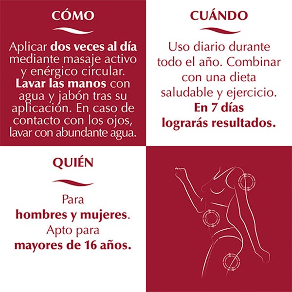Aplica el gel quemagrasas Spicyslim 2 veces al día mediante masaje activo y enérgico circular.