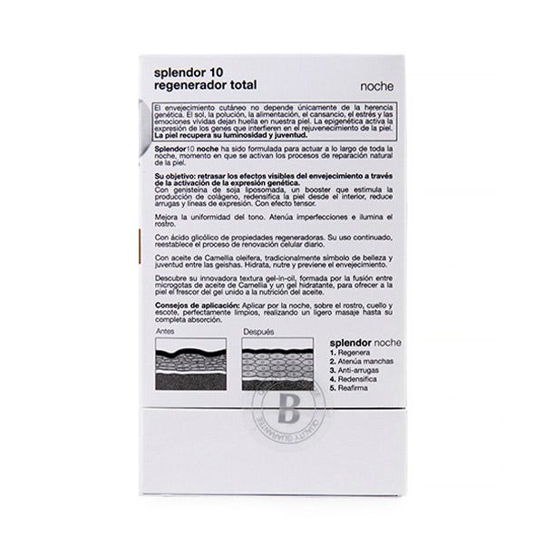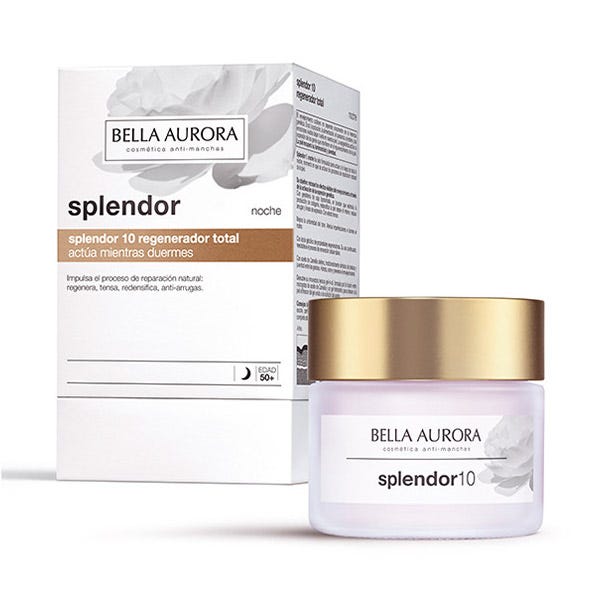 Splendor 10 Regenerador Total noche de Bella Aurora es la crema de tratamiento nocturno del envejecimiento cutáneo que actúa de noche retrasando el envejecimiento de la piel y recupera la luminosidad y juventud de la piel.