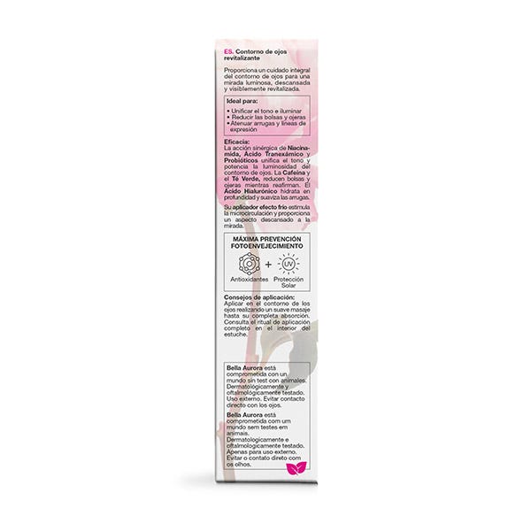 La acción sinérgica de Niacinamida, Ácido Tranexámico y Probióticos unifica el tono y potencia la luminosidad del contorno de ojos.
