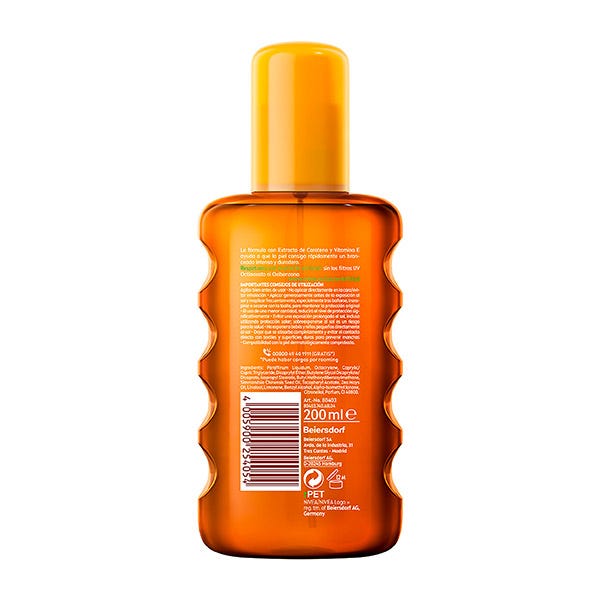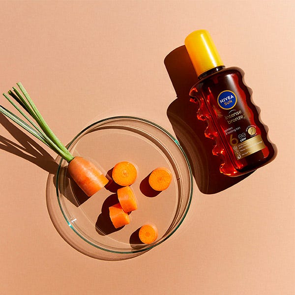 NIVEA SUN Aceite Solar Zanahoria FP 6 protege frente a los rayos UV y ayuda a que la piel consiga rápidamente un bronceado intenso y duradero sin necesidad de autobronceador. Su fórmula con Extracto de Caroteno y Vitamina E es resistente al agua y deja una sensación sedosa en la piel.