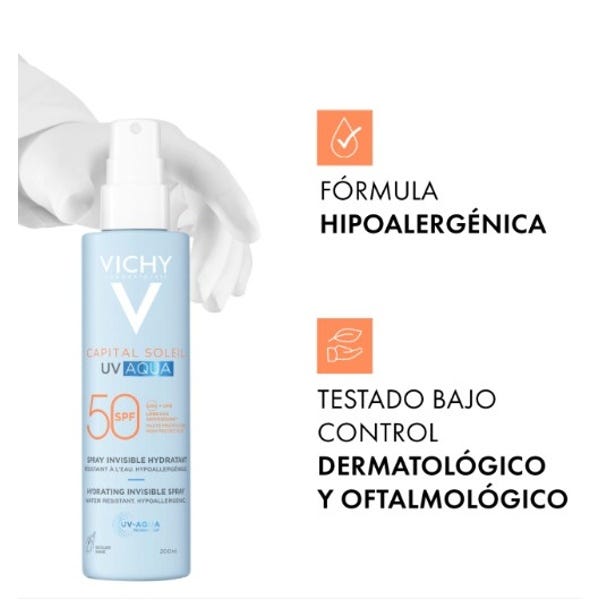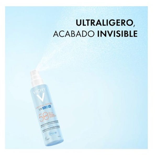 Otro punto importante de Capital Soleil UV Aqua Spray Hidratante Invisible SPF50 de VICHY es su textura ligera, que se absorbe con rapidez y deja una sensación cómoda en la piel. VICHY ha formulado Capital Soleil UV Aqua Spray Hidratante Invisible SPF50 para ofrecer protección alta con una aplicación práctica.