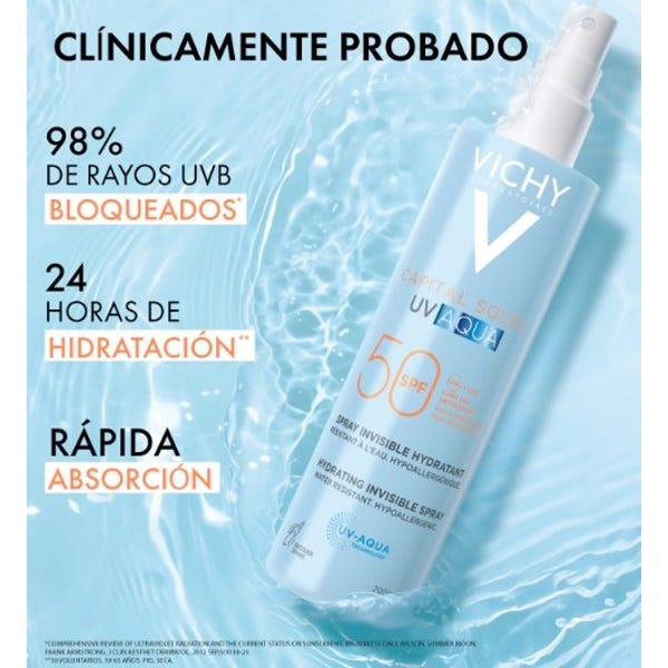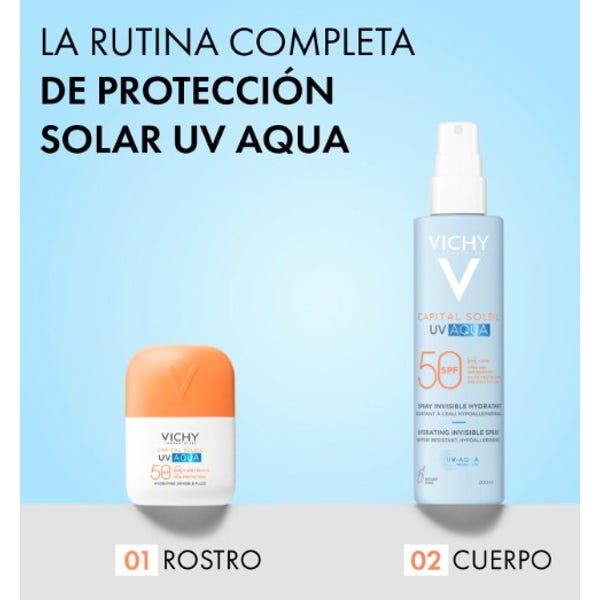 VICHY desarrolla el Capital Soleil UV Aqua Spray Hidratante Invisible SPF50 con una tecnología ligera que facilita su aplicación tanto en rostro como en cuerpo. Gracias a la investigación de VICHY, el Capital Soleil UV Aqua Spray Hidratante Invisible SPF50 ayuda a proteger la piel frente a rayos UVA, UVB y UVA largos.