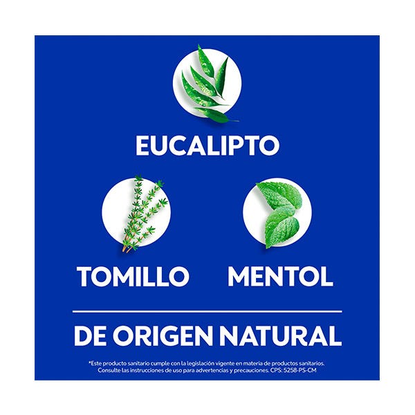 • Aceites esenciales de tomillo y eucalipto de origen natural, mentol.
