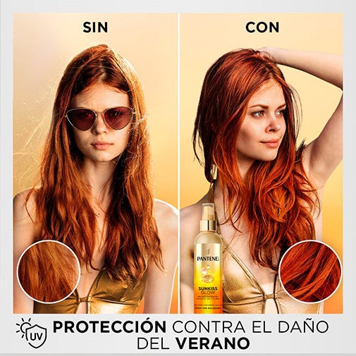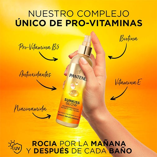 Pantene Sunkiss Glow: Tratamiento Sin Aclarado ¡Este verano disfruta de un pelo fuerte y sano! Enriquecido con Pro-Vitamina B5 y Vitamina E, esta fórmula ligera y no grasa nutre y repara profundamente tu pelo, manteniéndolo fresco y sin encrespamiento, además de protegerlo de los daños causados por los rayos UVA, UVB, sal y cloro.
