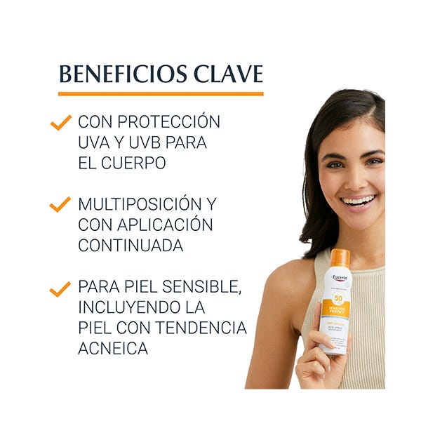 Eucerin Sun Spray Transparent Dry Touch Sensitive Protect FPS 50 es un protector solar corporal en spray apto para piel sensible, incluyendo la piel con tendencia acneica.