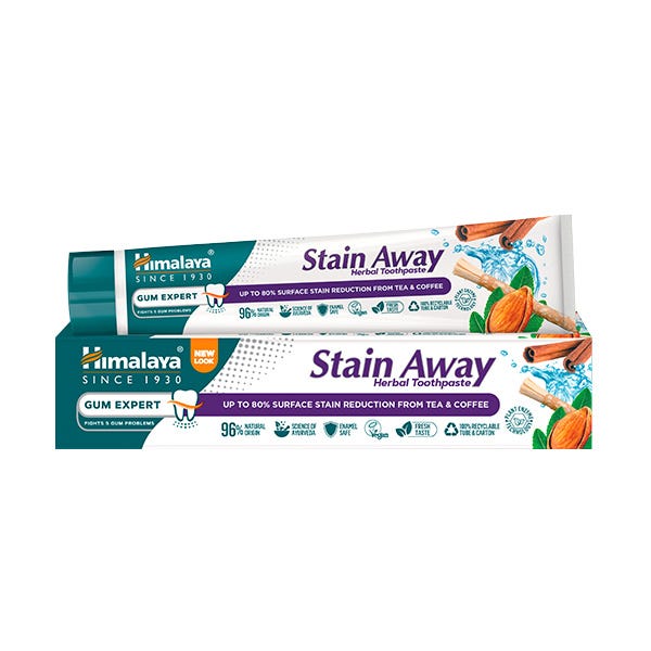 La pasta dentífrica Stain-Away a base de hierbas tiene una formulación innovadora con tecnología basada en enzimas de plantas como la papaya y la piña, que elimina las manchas producidas por el té, el café o el tabaco de los dientes en cuatro semanas, dejándolos tres tonos más blancos.