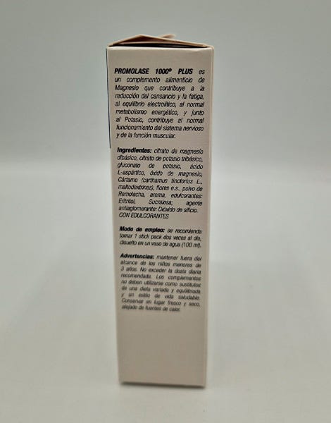 Promolase 1000 Plus es un complemento alimenticio de magnesio y potasio que contribuye a la reducción del cansancio y la fatiga, al equilibrio electrolítico y al metabolismo energético normal.