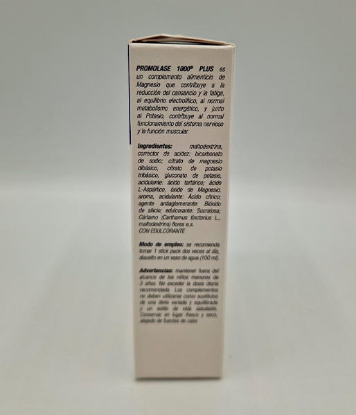 Promolase 1000 Plus es un complemento alimenticio de magnesio y potasio que contribuye a la reducción del cansancio y la fatiga, al equilibrio electrolítico y al metabolismo energético normal.
