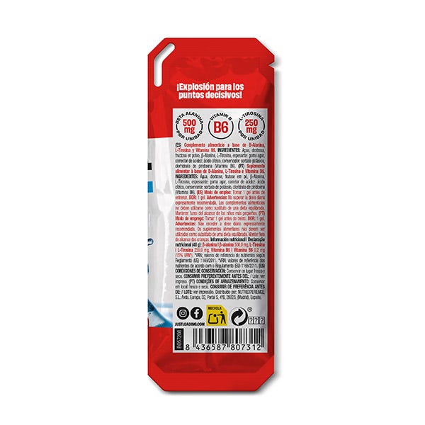 Agua, Dextrosa, Fructosa en polvo, β-alanina, L-tirosina, Espesante: goma agar, Corrector de acidez: ácido cítrico, Conservador: sorbato potásico, Clorhidrato de piridoxina (Vitamina B6).