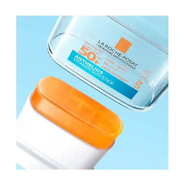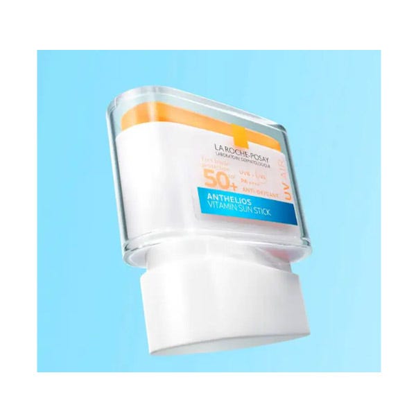 Anthelios UVAIR Vitamin Sun Stick SPF50+ de La Roche-Posay ofrece una protección muy alta contra los rayos UVA y UVB, a la vez que preserva la luminosidad natural de la piel. Enriquecido con vitamina E y astaxantina, combate el estrés oxidativo causado por el sol y la contaminación, ayudando a mantener una piel joven y radiante.