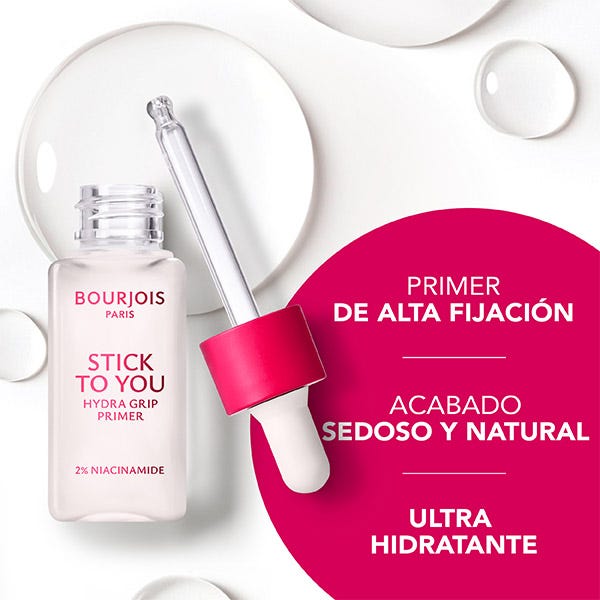 Descubre Bourjois Stick to You Hydra Grip Primer, la prebase que transforma tu rutina de maquillaje desde el primer paso. Con una textura ligera e hidratante, este primer se funde con la piel al instante, aportando un extra de hidratación que se nota al momento. El acabado es suave, sedoso y completamente neutro, sin alterar el tono ni la textura de tu base de maquillaje. Su fórmula está enriquecida con un 2 % de niacinamida, un ingrediente clave que ayuda a unificar el tono de la piel y mejorar su aspecto con cada uso. Además, su innovador efecto grip asegura una fijación duradera sin dejar sensación pegajosa. Solo notarás que tu maquillaje se mantiene intacto durante horas, con una piel que se ve y se siente bien. Lo único que se pega es tu maquillaje.