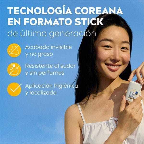 NIVEA SUN Protección Facial Transpirable Stick UV Tacto Sedoso SPF 50+ proporciona protección facial que va más allá del SPF. Nuestra tecnología UV transpirable más conveniente combate el fotoenvejecimiento sin obstruir los poros y proporciona una muy alta protección frente a los rayos UVA/UVB. Con tecnología de stick coreana de última generación, protege las áreas faciales delicadas mientras deja que la piel respire. La fórmula de Tacto Sedoso no deja acabado graso, es invisible, resistente al agua, sin perfume y no comedogénica. Su innovadora forma de gota mantiene las manos limpias, ideal para el uso diario y la reaplicación a lo largo del día. Ligero, dermatológica y oftalmológicamente aprobado, garantiza una protección solar invisible y a prueba de sudor para pieles delicadas en cualquier momento del día.