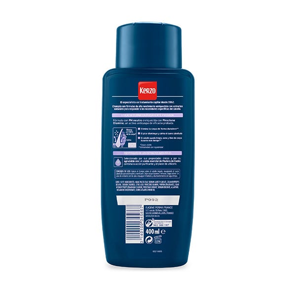 Champú stop caspa y antipicores de Kerzo. Este champú elimina el 100% de la caspa y calma el cuero cabelludo. El aceite escencial de madera de cedro combina la acción calmante.