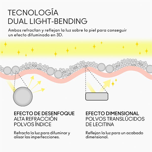Su tecnología Dual Light-Bending utiliza polvos de alto índice de refracción para refractar la luz junto con polvos de lecitina para reflejar la luz en la piel y conseguir un efecto difuminado 3D.