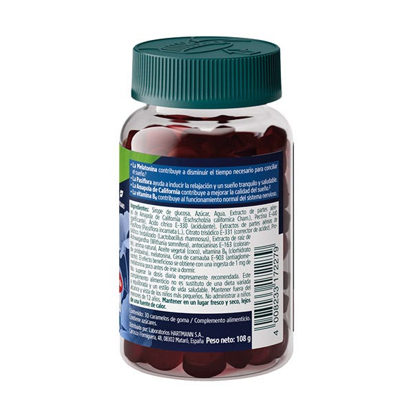Ingredientes: Sirope de glucosa, Azúcar, Agua, Extracto de partes aéreas de Amapola de California (Eschscholzia californica Cham.), Pectina E-440 (gelificante), Ácido cítrico E-330 (acidulante), Extractos de partes aéreas de Pasiflora (Passiflora incarnata L.), Citrato trisódico E-331 (corrector de acidez), Lactobacillus Rhamnosus, Extracto de raíz de Ashwagandha (Withania somnifera), antocianinas E-163 (colorante), aroma natural, Aceite vegetal (coco), vitamina B6 (clorhidrato de piridoxina), melatonina, Cera de carnauba E-903 (antiaglomerante).