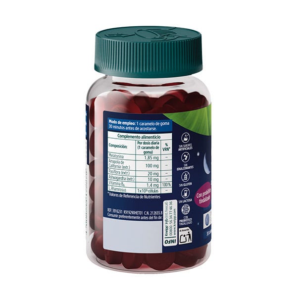 Con Melatonina (1,85 mg), Amapola de California, Pasiflora, Ashwagandha, vitamina B6 y probiótico L. Rhamonosus.
