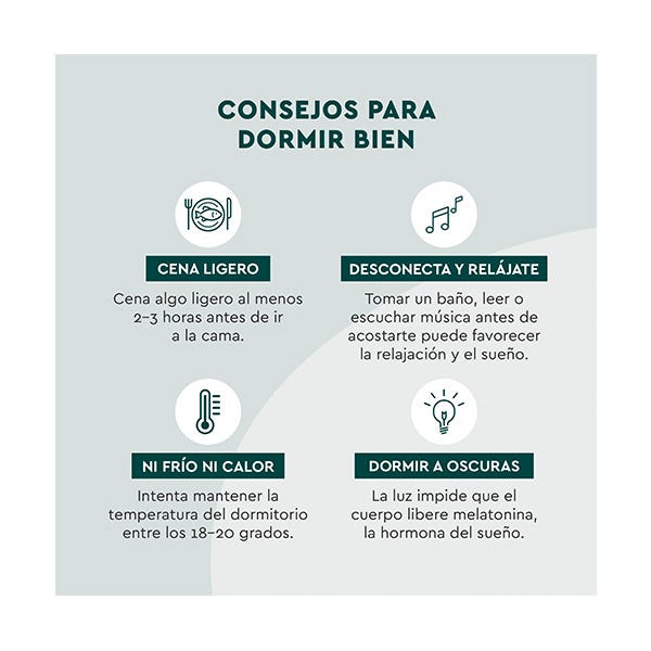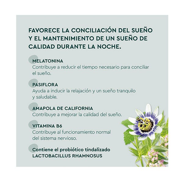 La Melatonina contribuye a disminuir el tiempo necesario para conciliar el sueño, la Pasiflora ayuda a inducir la relajación y un sueño tranquilo y saludable, la Amapola de California contribuye a mejorar la calidad del sueño, la vitamina B6 contribuye al funcionamiento normal del sistema nervioso y el probiótico ayuda a la digestión y el funcionamiento intestina normal.