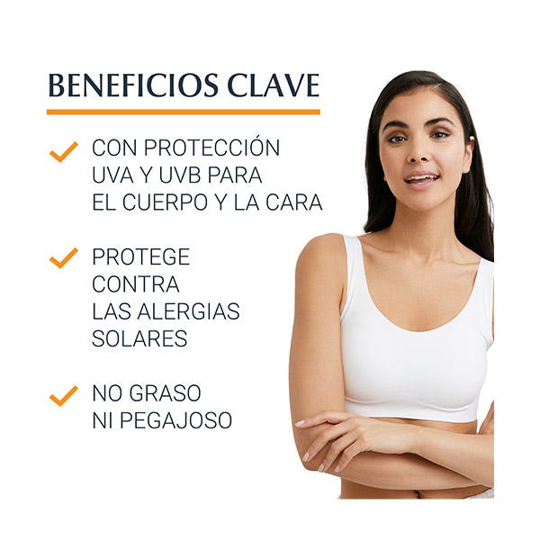 El protector solar para alergias solares ofrece una protección muy alta frente a rayos UV: los filtros frente a rayos UVA y UVB cumplen los altos estándares definidos por Cosmetics Europe y los niveles de protección frente a rayos UVA superan las recomendaciones de la UE. con el sistema Advanced Spectral Technology de Eucerin, combina filtros altamente fotoestables y de amplio espectro frente a rayos UVA y UVB, con licocalcón A para neutralizar los radicales libres causados por los rayos UV y la luz HEVL.