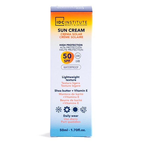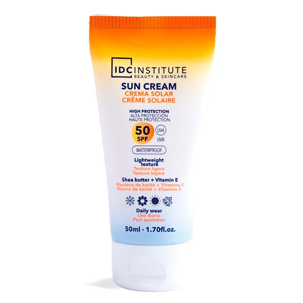 IDC INSTITUTE SUN CREAM SPF 50 WATERPROOF à IDC Institute Sun Cream SPF 50 es el protector solar facial perfecto para mantener tu piel protegida contra el daño solar. Con una fórmula de textura ligera que se absorbe al instante, este protector solar ofrece una alta protección contra los rayos UVA y UVB sin dejar una sensación grasa. Además, es waterproof, lo que lo hace ideal para cualquier actividad al aire libre, ya sea en la ciudad, en la playa o mientras haces deporte. Mantén tu piel protegida y luminosa bajo el sol con este esencial de cuidado diario.