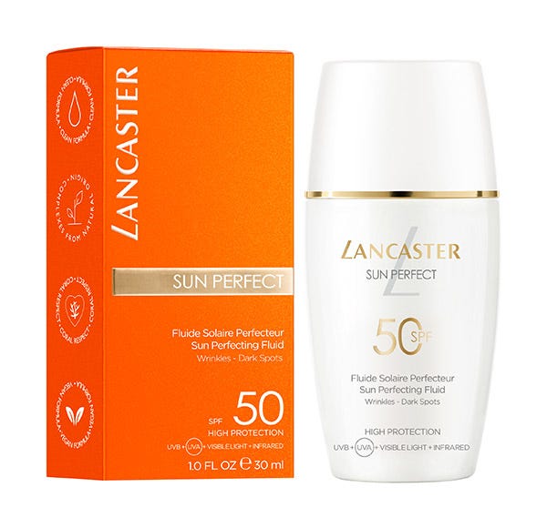 La evolucionada fórmula de Sun Perfect Sun Perfecting Fluid SPF50 ofrece la exclusiva y avanzada tecnología de protección lumínica de Lancaster, que actúa frente al 100 % del espectro solar*, junto con la tecnología antiedad, el sistema de reparación solar de origen natural y el complejo potenciador de luminosidad.