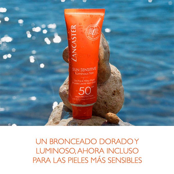 ¿Y si incluso las pieles más sensibles pudieran lograr una luminosidad dorada duradera mientras se benefician de nuestra mejor protección solar, evitando el enrojecimiento y la sensación de incomodidad? La gama Sun Sensitive de Lancaster combina nuestra Full Light Technology, que actúa en el 100% del espectro solar* para obtener la protección más completa, junto con nuestro nuevo Complejo Sunsicalm de origen natural que calma y preserva la piel sensible de los daños inducidos por el sol y nuestro Complejo Activador del Bronceado de origen natural para un bronceado luminoso y duradero. Ahora también limpias y respetuosas con el océano, las fórmulas Sunsicalm Sensitive permiten disfrutar del sol con una protección eficaz*, respetando tanto la piel como el océano.